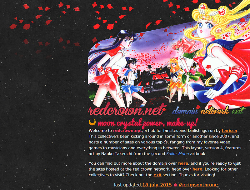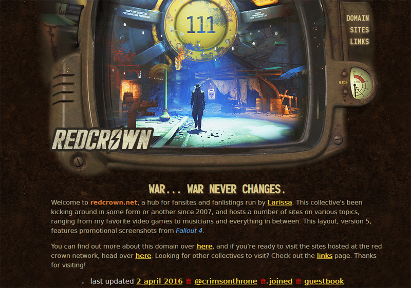 redcrown.net was registered in 2009, but it wasn't until the spring of 2013 that I started using it as my collective. I originally registered this domain for the purpose of hosting my Ivalice-related websites, but when I realized ivalice.org was available, I swapped them out. The name "red crown" comes from the theme song of Dissidia: Final Fantasy, Cosmos/Chaos/The Messenger, but it's generic enough to work on its own, which is why I kept it. (The summary here is that I am a huge nerd for Final Fantasy, if my collective hasn't tipped you off already. Also, there is nothing more "me" than an obscure reference to FF music.)